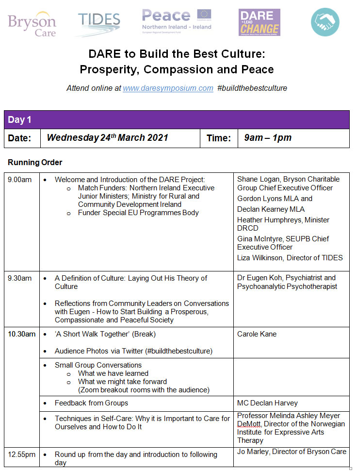 Welcome to the DARE to lead change Symposium 2021. This symposium will showcase the key learning from our Peace IV SEUPB funded regional project and offer an exploration of actions necessary to build our future orientated culture of prosperity, compassion and peace. In keeping with the unique perspective of DARE and in recognition of our new demographic landscape we will include the theme of ethnic diversity alongside insights into local PUL and CNR culture. This is increasingly relevant in light of our up and coming census. In the symposium we want to lay out the challenge of systemic thinking and planning and the benefits of structures and policies that recognise the importance of care for all in a post conflict society, more recently overwhelmed by the Coronavirus pandemic. This will be an event that offers hope and vision to the audience, using direct learning from DARE participants and knowledge experience and real exemplars from key contributors.